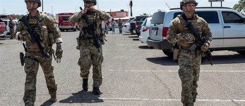 | Des policiers d'élite arrivent sur les lieux de la fusillade dans le centre commercial Wal-Mart à El Paso, au Texas, le 3 août. |