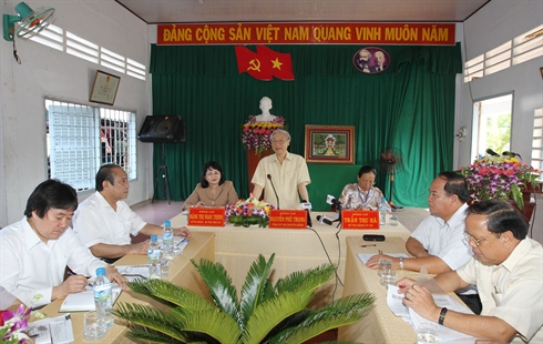 | Le secrétaire général du Parti communiste du Vietnam, Nguyên Phu Trong (debout) a travaillé le 26 novembre avec les autorités de la province de Vinh Long (delta du Mékong). |