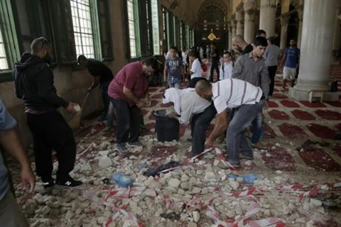 | Des Palestiniens nettoient la mosquée d'Al-Aqsa après les heurts ayant opposé des musulmans aux forces de l'ordre israéliennes, le 13 septembre à Jérusalem. |