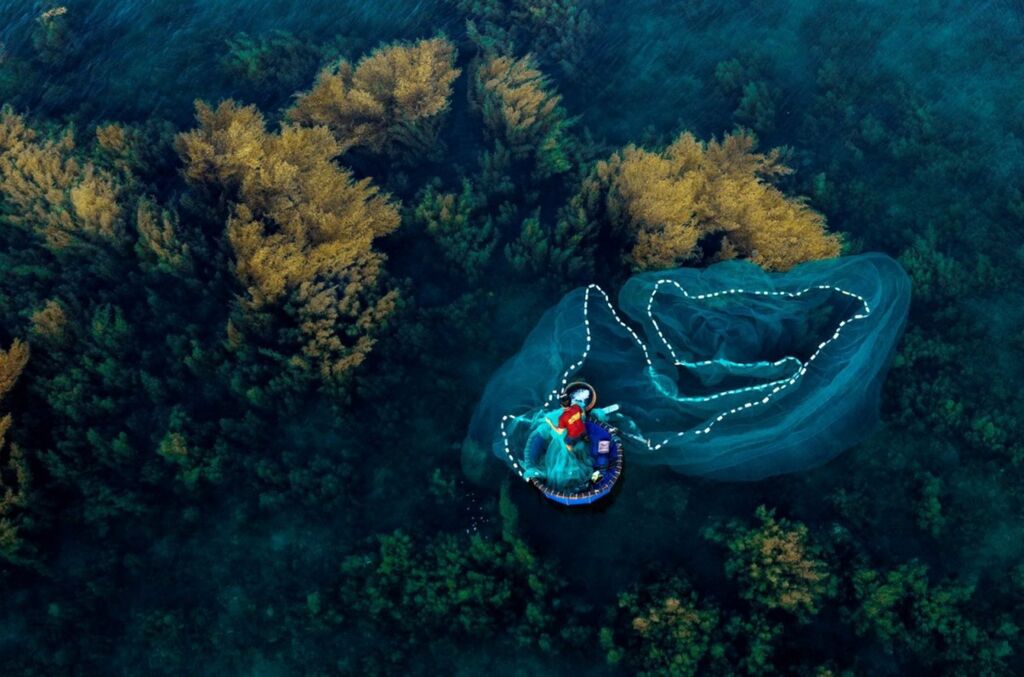 Les algues jaune-brun flottantes, l’eau cristalline, ainsi que les pêcheurs debout dans des bateaux-paniers et lançant des filets pour attraper des poissons, tout cela forme une image absolument époustouflante.