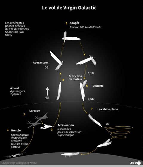 | Schéma explicatif des différentes étapes du vol prévu du vaisseau spatial de Virgin Galactic. |