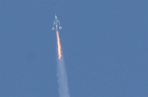 | Le vaisseau de Virgin en juillet 2021 après son décollage pour l'espace depuis le Nouveau-Mexique, aux États-Unis. |