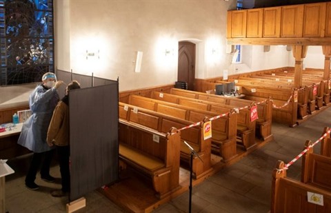 | Un soignant fait passer un test rapide au COVID-19 dans la Johanneskirche, une église protestante de Stuttgard (Sud de l'Allemagne), le 16 février. |