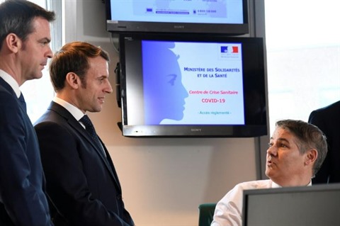| Emmanuel Macron (centre), visitent mardi 3 mars 2019 le Centre opérationnel de régulation et de réponse aux urgences sanitaires et sociales, à Paris. |
