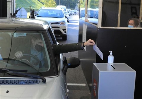 | Un électeur met son bulletin dans l'urne depuis sa voiture lors d'un vote anticipé pour les législatives, à Vilnius, en Lituanie, le 7 octobre 2020. |