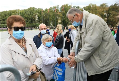 | Des électeurs se désinfectent les mains avant de déposer leur bulletin de vote, le 6 octobre 2020 à Vilnius, en Lituanie. |
