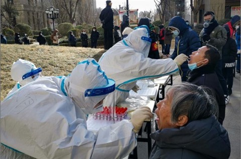 | Dépistages des habitants d'une zone résidentielle à Shijiazhuang, au sud de Pékin, le 6 janvier 2021. |