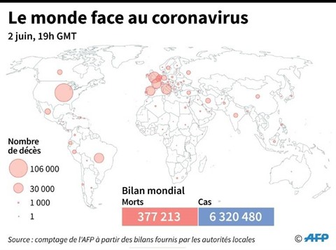 Au total, la pandémie de COVID-19 a tué plus de 382.000 personnes sur la planète depuis son apparition en décembre 2019 en Chine, selon un bilan établi mercredi 3 juin par l'AFP à partir de sources officielles.