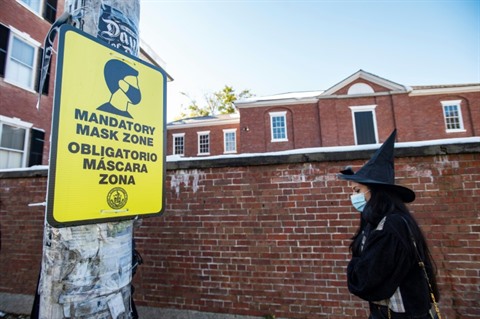 | Une femme déguisée en sorcière pour Halloween devant un panneau qui signale l'obligation du port du masque, à Salem (États-Unis), le 31 octobre. |