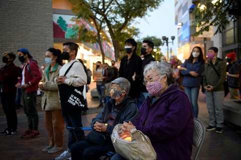| Des personnes portant des masques tiennent des bougies lors d'un hommage aux victimes du coronavirus le 20 mars dans le quartier de Little Tokyo à Los Angeles, Californie. |