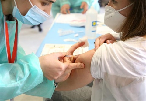 | Une soignante se fait vacciner contre le COVID-19 dans un centre de fortune installé dans un stade de football de Tirana, le 12 janvier. |