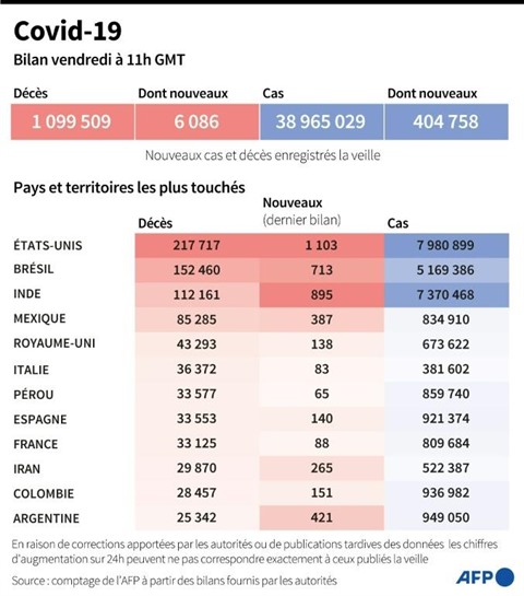 Dans le monde, plus de 1,1 million de décès ont été recensés, selon un comptage réalisé vendredi 16 octobre par l'AFP à partir de sources officielles. Et pour la seule journée de jeudi 15 octobre, le chiffre des nouvelles contaminations a atteint 400.000 nouveaux cas. Quelque 38,99 millions de cas ont été officiellement comptabilisés, dont plus de 26,6 millions ont été guéris. L'Italie a enregistré vendredi 16 octobre 10.010 nouveaux cas, le chiffre le plus haut jamais atteint en 24 heures par ce pays.
