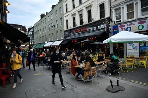 | Des personnes à la terrasse de bars, le 16 octobre dans le quartier de Soho, à Londres. |