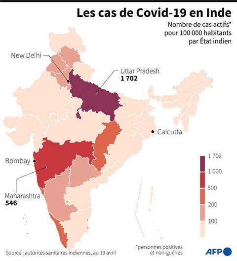 | Carte représentant le nombre de cas actifs pour 100.000 habitants par État indien, selon les autorités sanitaires indiennes au 19 avril. |