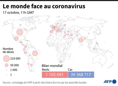 Dans le monde, tous les indicateurs sont au rouge : au moins 1.105.691 décès et près de 39,4 millions de contaminations ont été recensés depuis le début de la pandémie, selon un comptage réalisé samedi 1è octobre par l'AFP. Pour la seule journée de vendredi 16 octobre, 6.118 décès et 403.629 nouveaux cas ont été enregistrés.