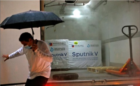 | Les premières doses du vaccin russe Spoutnik V destinées à l'Autorité palestinienne sont arrivées à Ramallah, en Cisjordanie, le 4 février. |