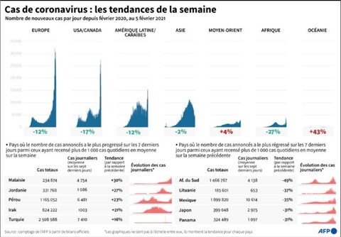 Selon un bilan établi jeudi 4 février, la pandémie a fait au moins 2.285.334 morts dans le monde et plus de 104.848.470 cas d'infection ont été officiellement diagnostiqués.