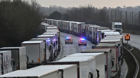 | Longue file d'attente de poids-lourds vers l'entrée du port de Douvres, le 22 décembre. |