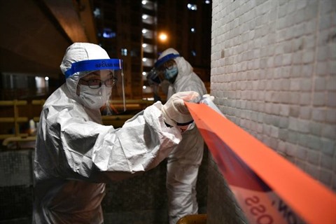 | Policiers à Hong Kong en tenue de protection installent un cordon autour d'un bâtiment le 11 février. |