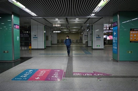 | Un homme dans une station de métro de Pékin, le 10 février. |