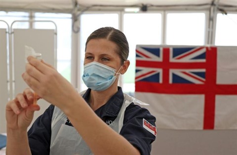 | Préparation d'une injection du vaccin d'Oxford/AstraZeneca contre le COVID-19, dans un centre de vaccination à Bath, en Angleterre, le 27 janvier 2021. |
