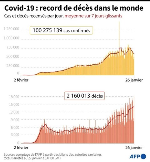 | Cas de COVID-19 et décès quotidiens officiellement recensés dans le monde, au 26 janvier. |
