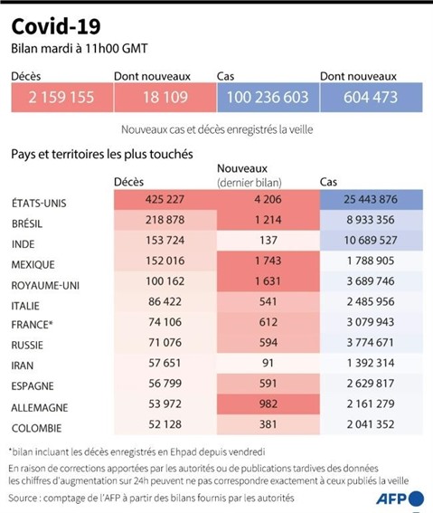 | Bilan mondial de la pandémie de nouveau coronavirus, au 27 janvier à 11h00 GMT. |