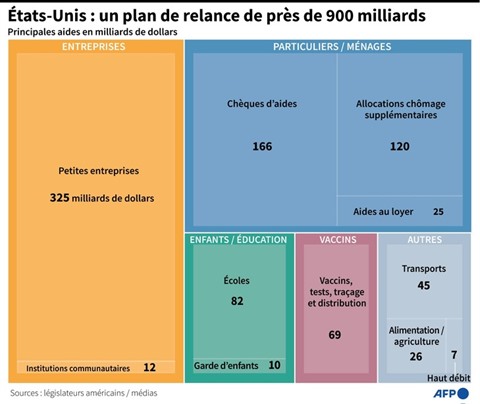 Après des mois de blocage, démocrates et républicains avaient annoncé dimanche être parvenus à un accord de principe sur ces mesures comprenant notamment des chèques aux familles les plus fragilisées, des aides aux petites entreprises et aux écoles, des allocations chômage supplémentaires de 300 dollars par semaine ou encore une enveloppe pour la distribution équitable de vaccins contre le COVID-19.