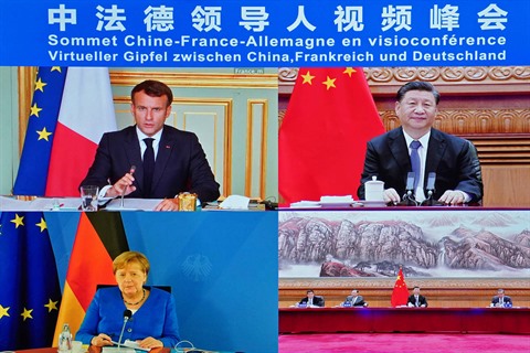 | Visioconférence entre le président français Emmanuel Macron (gauche), son homologue chinois Xi Jinping et la chancelière allemande Angela Merkel. |