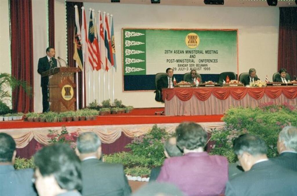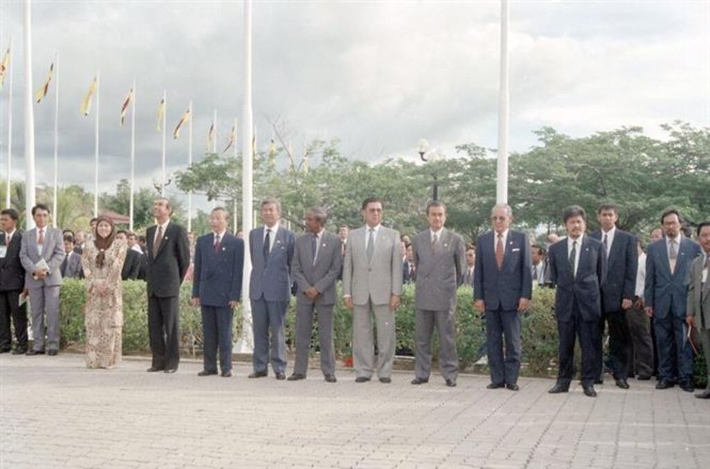 | Les ministres des Affaires étrangères des pays de l’ASEAN assistent à la cérémonie de levée du drapeau vietnamien au Centre international des congrès de Bandar Seri Begawan, le 28 juillet 1995. |
