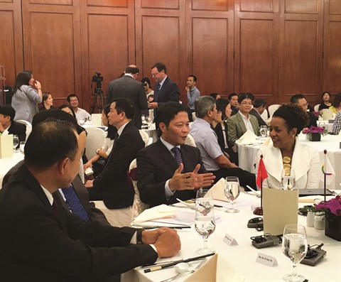 | La secrétaire générale de la Francophonie, Michaëlle Jean (1er plan, droite), lors de sa rencontre avec les entreprises francophones au Vietnam, le 11 octobre à Hanoï. |