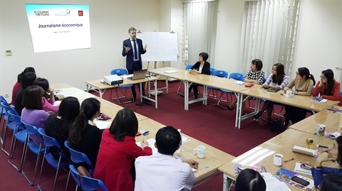 | Un cours de formation au journalisme économique destiné à des journalistes du Courrier du Vietnam organisé à Hanoï et financé par l'OIF. |