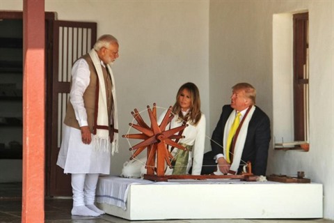 | Le président américain Donald Trump (droite), son épouse Melania (centre) et le Premier ministre indien Narendra Modi auprès d'une roue à tisser à l'ashram Gandhi à Ahmedabad (Inde), le 24 février |