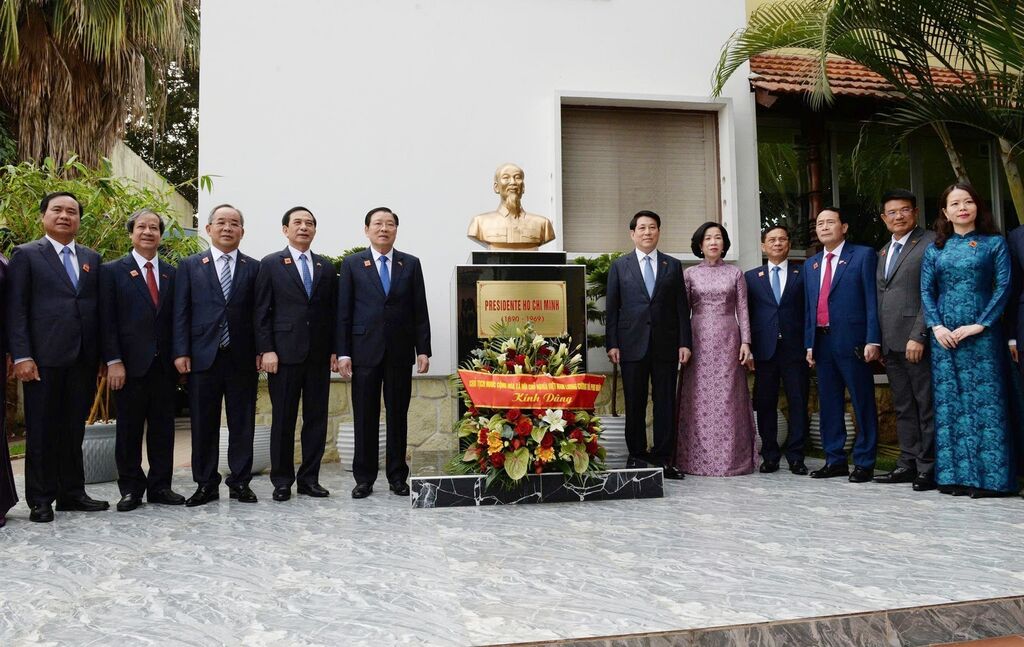 | Le président Luong Cuong (6e à droite) dépose, le 7 août, des fleurs au buste du Président Hô Chi Minh au sein de l’ambassade du Vietnam à Luanda. |