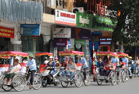| Touristes étrangers à la découverte du Vieux quartier de Hanoï à cyclo. |