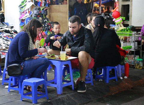 | Deux touristes étrangers dégustent des en-cas sur le trottoir de la rue Hô Hoàn Kiêm. |