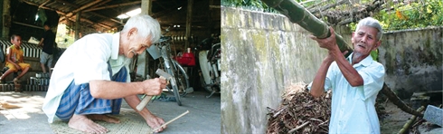 | Malgré son âge (93 ans), M. Dàm porte le bambou sur ses épaules et tisse des paniers. |