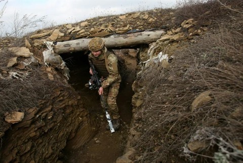 | Un soldat ukrainien dans une tranchée sur la ligne de front dans l'Est du pays, le 22 février 2022. |