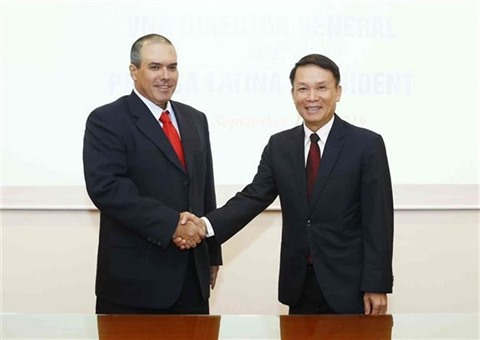 | Le directeur général de la VNA, Nguyên Duc Loi (droite), et le président de Prensa Latina, Luis Enrique Gonzalez Acosta, le 10 septembre à Hanoï. |