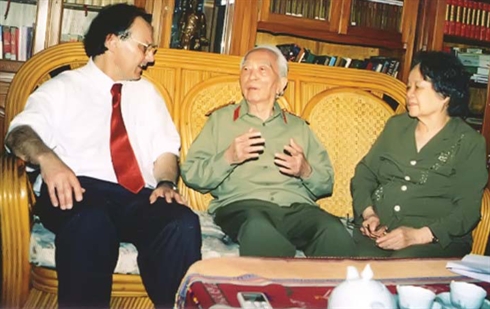 | L’historien français Alain Ruscio (gauche) s’entretient avec le général Vo Nguyên Giáp et sa femme. |