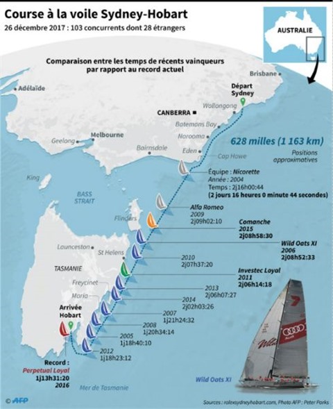 Il est détenu par le voilier australien Perpetual Loyal - aligné cette année sous le nom de InfoTrack - qui avait franchi l'an dernier la ligne d'arrivée à Hobart en un jour, 13 heures, 31 minutes et 20 secondes.