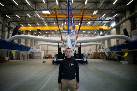 | Armel Le Cleac'h sur un des foils de Banque Populaire XI Ultim, le 26 avril, la veille de son lancement. |
