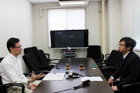 | Le Docteur japonais Tomotaka Shoji (gauche) accorde une interview au correspondant de la VNA. |