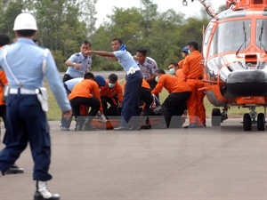 | Les secouristes indonésiens transportent un corps d'une victime du vol QZ8501. |