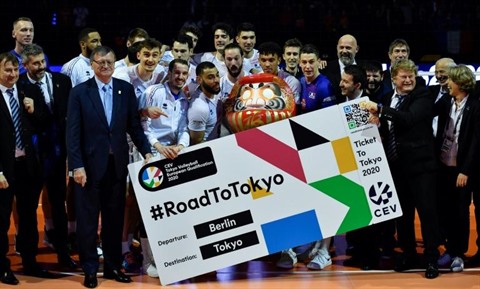 | Le groupe France, joueurs, staff et officiels, savoure la qualification pour les JO-2020 après avoir obtenu son "Ticket to Tokyo", le 10 janvier à Berlin. |