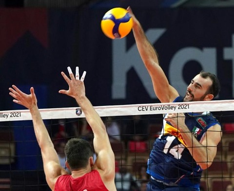 | Gianluca Galassi (droite) avec l'Italie contre la Serbie à l'Euro de Volley à Katowice. |