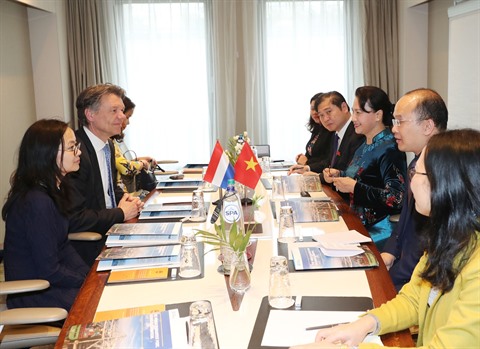 | La présidente de l’AN vietnamienne, Nguyên Thi Kim Ngân a reçu 26 mars (heure locale) à La Haye le directeur du port international de Rotterdam, René Van Der Plas. |