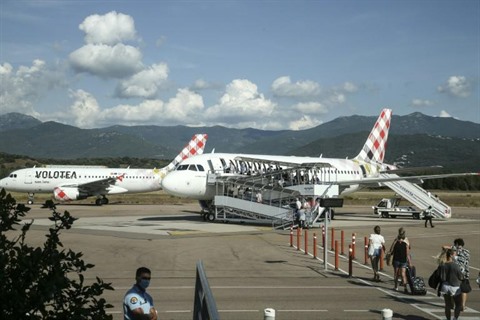 | Des avions de la compagnie Volotea sur le tarmac de l'aéroport d'Ajaccio, le 14 juillet 2020. |