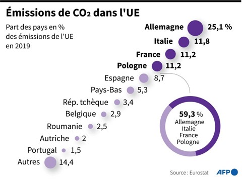 | Émissions de CO2 dans l'UE, part des pays en % des émissions de l'UE en 2019, selon Eurostat. |