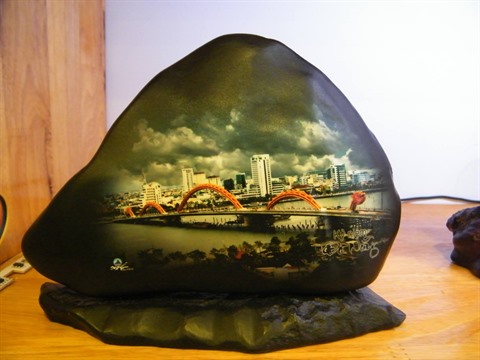 | Le pont Rông (Dragon) de Dà Nang imprimé sur une pierre noire. |